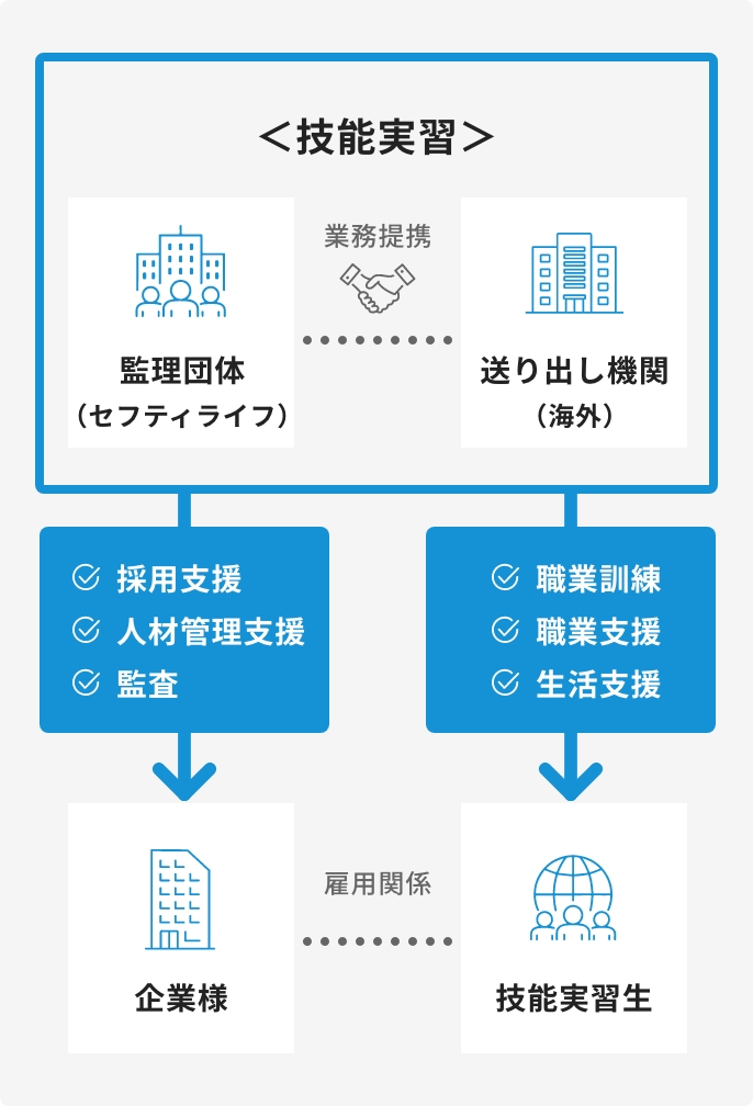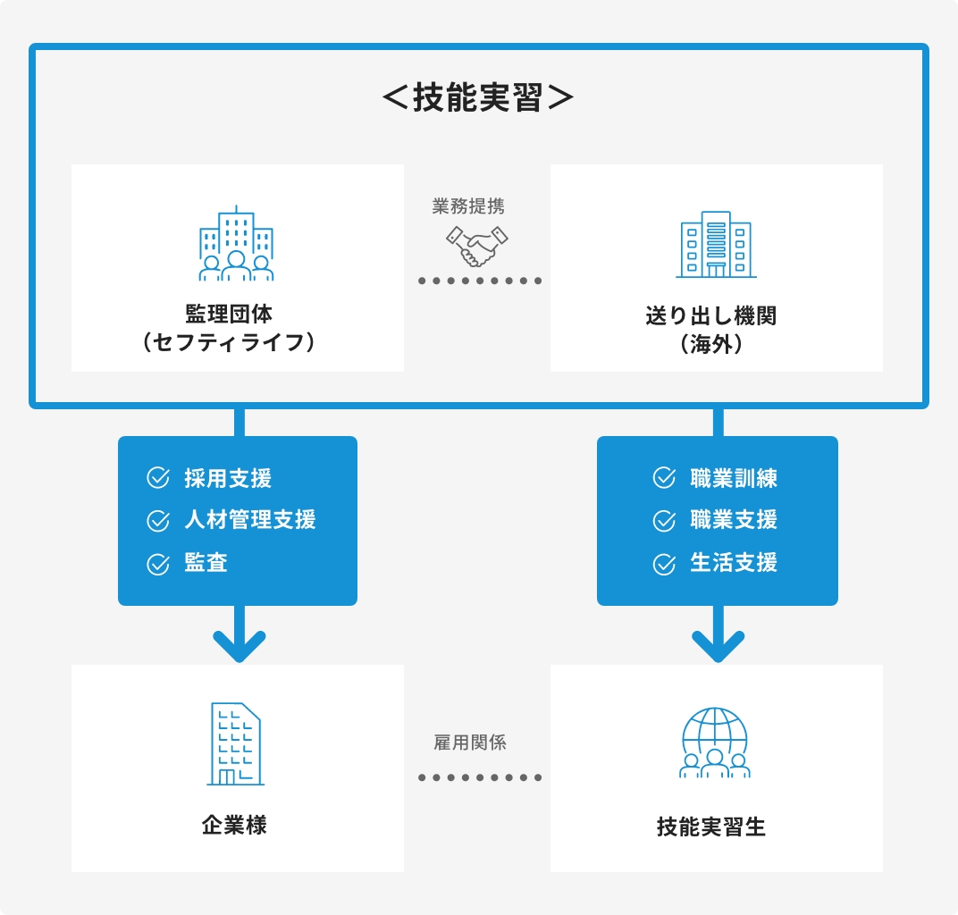 セフティライフは、法令違反がなく、技能評価試験の合格率・指導・相談体制等について一定の要件を満たしていると認定された「優良な監理団体」です。